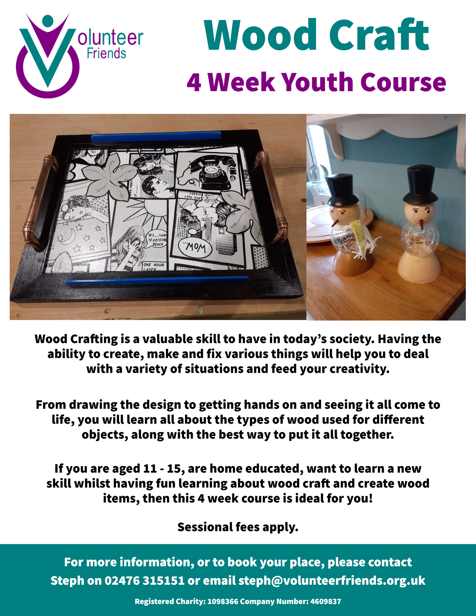 Our 4 week Youth Wood Craft Course run from 1.15pm to 3.15pm on an ad hoc basic and have limited availability, therefore boking in advance is a must. For additional information, please contact our office and inquire with Steph.